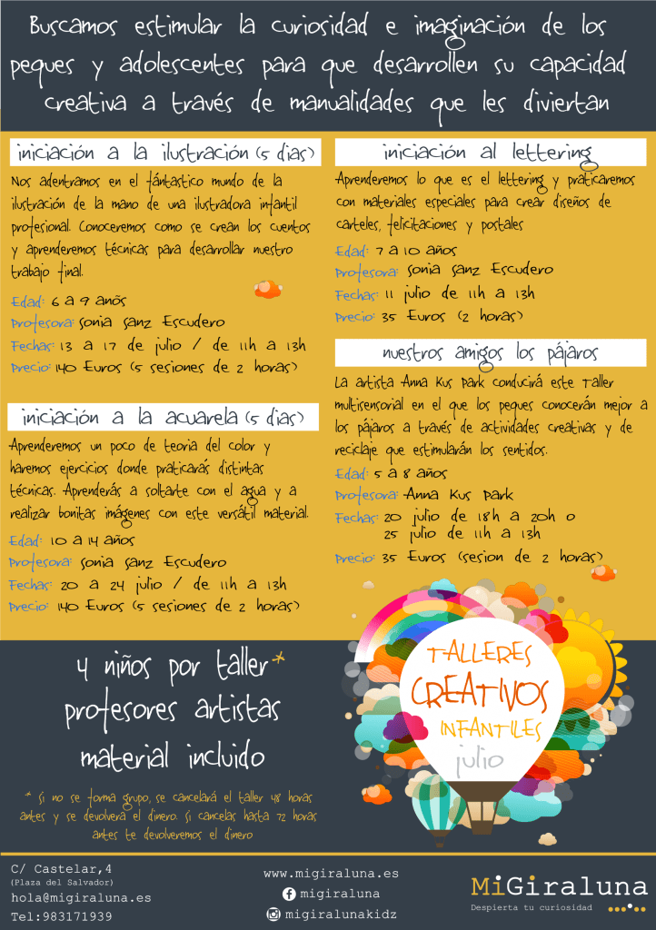 Os presentamos nuestros talleres creativos infantiles para este mes de Julio. Despertaremos la curiosidad por la naturaleza y potenciaremos las habilidades artísticas de cada participante con actividades divertidas preparadas por nuestros profesores-artistas.